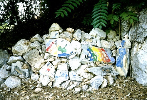 Marcel Alocco a été exposé plus d’une vingtaine de fois dans les deux galeries d’Alexandre de la Salle entre Vence et Saint-Paul, il y était aussi « en permanence ». Mais revenons à « Lisières Arlequin », il y a aussi 7mn23 d’interview dans le jardin de la galerie, près d’un mur en pierres sèches, Marcel tenant un fragment de barri qui figure dans l’expo, une pierre de Lascaux, ou d’Altamira, comme le lui suggère Pierre Chaigneau. Cette interview est très sensible, je l’ai numérisée en couleurs d’origine, elle se trouve sur You Tube en noir et blanc, c’est ainsi qu’elle avait fait partie d’un montage d’interviews d’artistes de l’Ecole de Nice présenté dans l’auditorium du MAMAC en 1997, à l’époque de « Ecole de Nice. » à la galerie.