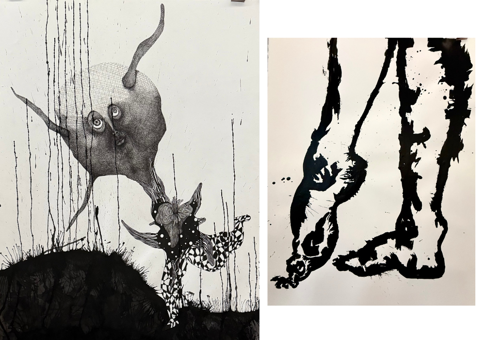 Ces dessins qu’il décline dans différentes dimensions, de la feuille A4 à des tailles excédant deux ou trois mètres de haut, prennent une force et une présence particulière quand il occupent de grands murs, affirmant une présence remarquable, puissante.