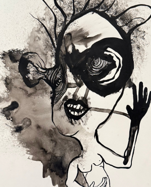 À partir d’autoportraits photographiques, Frédéric Fenoll peint à l’encre noire de grandes formes anthropomorphes qu’il éclabousse de taches d’encre noire ou de coulures plus ou moins maîtrisées qui les recouvrent en partie.