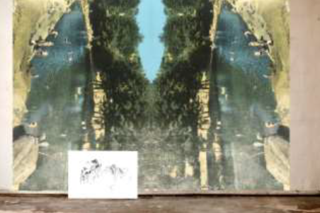 Dans un monde des apparences où tout n’est que leurre et illusion, un décor psychédélique émerge autour de l’univers du balnéaire : papier peint aux motifs de bouées de sauvetage, splash abyssal, amphore ornée d’une palme de plongée transportent le spectateur du désir amoureux au naufrage. L’agrandissement d’un paysage dupliqué par un effet miroir décale l’image de carte postale des années 1950 dans le champ de la peinture contemplative.
