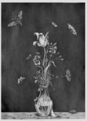Les sculptures minimalistes aux allures de cheminée ou de vase totémique jouent sur les frontières entre l’art, l’architecture et le design. Cette scène d’intérieur est agrémentée de natures mortes réalisées au graphite. Truffés de détails iconographiques et symboliques, les dessins décrivent l’impermanence et la relativité de toute chose, tel un memento mori. En face, un dispositif de mesure, Veille statistique physique, permet de faire l’expérience du hasard physique. Le comptage statistique forme une fluctuation sans cesse renouvelée et unique, à contempler comme un tableau, dans la matière, l’espace et le temps.