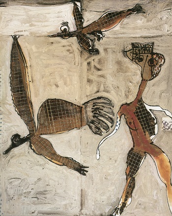 MB - Celle avec laquelle j’ai dormi, dans des draps qui un jour seront peut être peints, je l’ai tout de suite nommée Don Quichotte, parce qu’elle figure une sorte de moulin à vent brisé, et que le grand personnage, avec son espèce de jupe métallisée comme une armure, fait penser au chevalier de la triste figure, et que l’autre, plus petit, plus rond, formé de matière beaucoup plus paysanne, fait un Sancho Pança très présentable. On sent qu’il y a chez vous une lutte contre des géants. C’est ce qui explique sans doute votre goût pour les très grands formats.