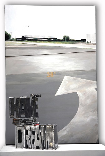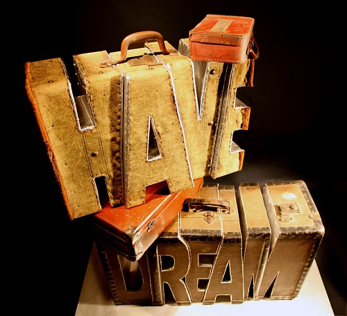 “I have a dream” est une autre de ses sculptures. Des valises découpées se superposent pour former le mot « I have a dream » en cuir des années 50.