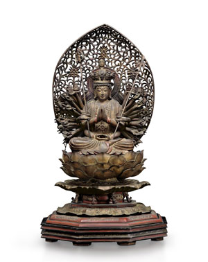Kannon, le boddhisattva de la compassion, est représenté assis sur un lotus et devant une mandorle ajourée. Sa tête est surmontée de 11 têtes plus petites : 10 sont réparties autour d’un chignon sur laquelle est placée la 11ème. Le bodhisattva est doté de 42 bras. 36 partent du dos et tiennent chacun un attribut différent. Les 6 bras restants se présentent par paires. Une paire fait le geste d’offrande, une autre tient un bol à aumônes dans la position de méditation, ce geste s’appelle « pâtra-mudrâ ». La 3ème paire (partant du dos) présente des attributs : la main droite tient un bâton de pèlerin, tandis que la main gauche tient un trident.