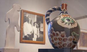 Les arts de la table, un thème présent à l’étage supérieur du Musée où la céramique vallaurienne a élu domicile. À côté des pièces rustiques de potiers de Vallauris, des ustensiles de cuisine ou « Terrailles », s’étend la collection Massier dès la fin du XIXème. « Une famille de Vallauris qui œuvra dans ses ateliers avec une centaine d’ouvriers », précise Sandra avant de poursuivre, « les Massier ont défriché la céramique artistique avec les bleus qui ont fait leur renom puis Clément, le chimiste de la famille développa une technique ancienne orientale ». Le lustre métallique donna ainsi naissance à des pièces très contemporaines, des faïences revêtues d’oxyde de platine qui rehaussèrent les vases de reflets irisés qui séduiront la riche clientèle cosmopolite fréquentant la Riviera au tournant du XXème siècle. Les créations des années cinquante figurent en bonne place (salle Madoura),