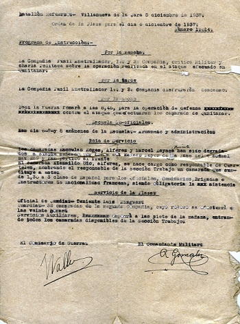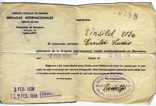 Sur une carte envoyée à ma mère qui à ce moment-là habitait Montrouge, d’Albacete, le 18 novembre 1936, il écrit que tout va bien, qu’il est bien portant, que Madrid est une ville admirable, ainsi que les Espagnols, qui ont une ressemblance énorme avec le peuple russe. Il est très content d’être là. C’est impressionnant d’avoir un ordre de service daté du 5 décembre 1937 pour la journée du 6 décembre : Por la manana, Por la tarde, Por la noche, où on confie ses missions au « camarada Eiensildo Udo » Il y a aussi un sauf-conduit avec entête de « Ejército Popular de Espana, Brigadas Internationales, Ejército del este, Delegación de Barcelona, Sicilia 22, Teléfono 50839 pour « El camarada portador Ersild Ludio (corrigé à la main Einsild Udo), voluntario de la Brigada Internacional »…