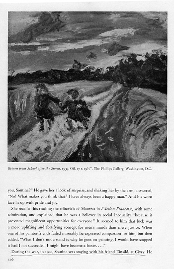 Mais bref, Wheeler écrit donc, en anglais, que pendant la guerre, en 1940, Soutine était auprès de son ami Einsild à Civry, qu’il y peignait des paysages, que le curé d’un village voisin était curieux de le voir peindre, qu’il cherchait sans cesse à le faire, que Soutine avait horreur de ça, et aurait bien aimé lui cacher ses toiles. Alors le curé, pas content, s’était mis à le soupçonner, était allé trouver les gendarmes pour le dénoncer comme agent secret à la solde de l’étranger. Soutine avait été arrêté, mis en garde à vue trois jours. (c’était dix jours, autant que je me souvienne). Quand Civry fut occupé, un officier allemand engagea la conversation avec Soutine dans la rue. Apprenant qu’il était un artiste, il lui demanda de peindre son fils âgé de quatre ans à partir d’une photographie. Soutine n’osa pas refuser et très vite lui fournit un petit tableau méticuleusement conventionnel. Et Monroe Wheeler de poursuivre sur une curieuse théorie concernant l’obsession de peindre des enfants deux par deux dans la nature : A la fin des années 20, explique-t-il, il y avait rue de la Boétie une peinture de Courbet représentant deux enfants sur la plage à Saint-Aubain. Soutine l’admirait et, dans son enthousiasme tyrannique (tyrannique ! où est-ce qu’il est allé chercher ça ?), emmenait tous ses amis la voir. Elle représentait un homme et une femme étendus au fond d’une falaise et deux petits enfants, seuls, debout, regardant droit devant eux. La peinture fut emmenée en Amérique, et, après 1930, Soutine ne put plus la voir. Mais pendant la guerre, ces enfants continuèrent de le hanter. Est-ce que c’est d’eux qu’il s’agit, sur la route du « Jour de grand vent » à Auxerre (1939), rendus minuscules par les arbres tourmentés, ou courant dans le « Retour de l’école après la tempête » ? (c’est-à-dire ma sœur et moi). Et Monroe continue : « Peut-être qu’au crépuscule de sa vie, dans cette parenthèse que constitua cette campagne d’adoption, des enfants deux par deux, que ce soit dans la fratrie ou dans l’amitié, ont pu lui sembler une image de la condition humaine sur cette planète plus acceptable que tout idéal proposé à son esprit par le patriotisme, la religion, l’amour romantique. J’avoue que cette interprétation de l’utilisation que Soutine aurait faite de ma sœur et moi dans des chemins ventés, et d’autres enfants appuyés sur des barrières me paraît un peu farfelue, je n’ai jamais entendu Soutine évoquer ce genre de choses...