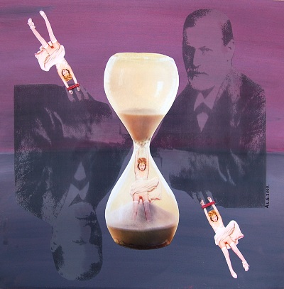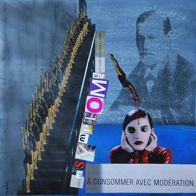 La participation d’Anne de la Salle à cette exposition de collages était bienvenue, car l’unité de son œuvre, fondée sur un discours persistant, pertinent, ne peut qu’intéresser. Et le mode collage, là aussi, n’est pas innocent. C’est comme si des bribes se collaient à la conscience – ou à l’inconscient – dont il faudrait se débarrasser pour accéder au désir primordial, cette rencontre inaugurale avec le monde, pour l’enfant, dans sa fraîcheur. Fraîcheur recouverte par l’autre de ses injonctions, et son prétendu savoir. Elle crée des collages depuis son adolescence, et dès le départ ils représentaient d’étranges liens entre les êtres et les choses, et parfois les animaux… d’une manière à la fois très élégante et angoissante. Comme si l’inéluctable de la manipulation était déjà là, reconnaissance de ce que l’Autre peut avoir de dangereux, asservissant, humiliant, mortifère. Des séries se sont multipliées, jusqu’à cette invitation à participer à l’exposition « Beau comme un symptôme » au CIAC (Centre International d’Art Contemporain, Château de Carros) en 2007, où Anne a mis en scène Sigmund Freud comme témoin de ce que l’on fait aux femmes, encore plus qu’à l’être humain. En manière de réparation ( ?), puisque, comme on sait, Freud considérait la femme comme le continent noir, à explorer après sa mort. Anne de la Salle met en scène la femme comme un continent lumineux au contraire, et sa lumière irradiante ne l’empêche pas d’être prise dans toutes sortes de rets, ficelles, grilles, et j’en passe… L’inconscient masculin lui ferait-il payer cette lumière intérieure ? la question est posée, elle n’est pas vraiment neuve ».