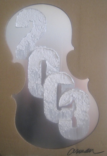 Chaque année, Arman envoyait ses vœux à Frédéric Altman sous la forme d’un collage, celui qui est présent dans l’exposition concerne l’année 2003 et dans le catalogue Frédéric a écrit : « Depuis sa disparition en 2005, Arman est toujours présent dans ma mémoire.