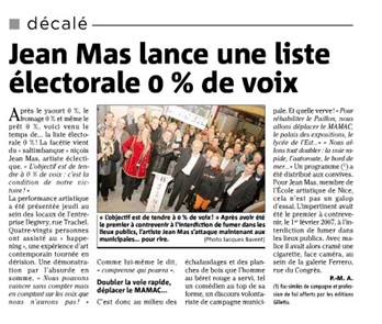 Issu du mouvement Fluxus et connu pour son objet princeps « Cage à Mouches », Jean Mas « synthétise l’esprit de l’Ecole de Nice… », aux dires de Pierre Restany. Dans un livre Emergence Jean Mas, qui vient de paraitre aux éditions Ovadia (2010), cet artiste précise son essence, son originalité et son niveau d’appartenance à l’Ecole de Nice.