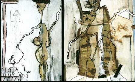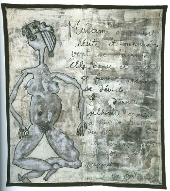 Comme j’arrivais un jour dans l’atelier de Jean-Jacques, il me montre, étendue au sol, une grande toile où semblait danser une dame surgie du Défilé... « Voilà me dit il J’ai essayé ça. Ça te dit quelque chose ? Si oui, écris. Si ça ne nous convient pas, on jettera. »