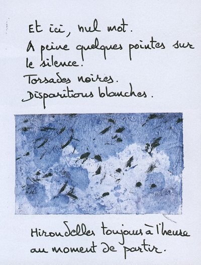 Cette forme particulière, plastique, de l’écoute se retrouve chaque fois que l’artiste est sollicité... Voyez, autre exemple, son interprétation du texte d’Alain Freixe « Les hirondelles ». Jean Jacques Laurent y transforme sa façon de remplir l’espace plastique ces petites touches, quasi écritures que l’on trouve en fond dans de nombreuses toiles. En y laissant respirer l’observation poétique de Freixe et sa propre fascination pour les mouvements des peuples oiseaux.