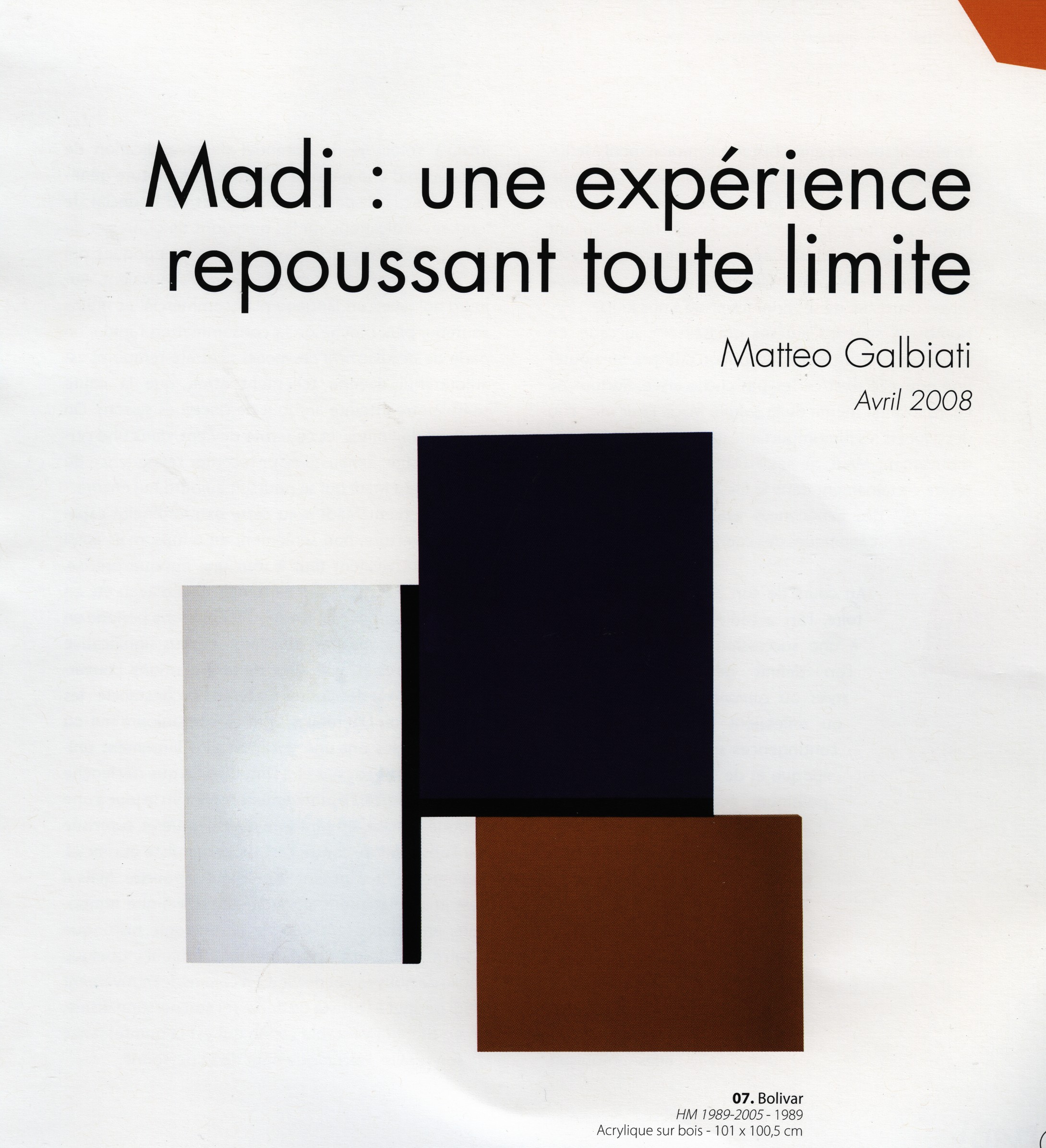 qui illustre le texte de Matteo Galbiati dans le catalogue de l’exposition, texte que le critique d’art italien avait écrit pour l’exposition « Le teorie del Madi » organisée par l’Association « Arte Madi Italia » à « Scoglio di quarto », Milan, sous la direction de Gabriella Brembati en 2008, et dont j’ai donné un témoignage filmé dans un chapitre précédent, j’en profite pour dire que le film « Le teorie del Madi » est de Ennio Gilardi et non de Matteo Galbiati lui-même, comme je l’avais cru..