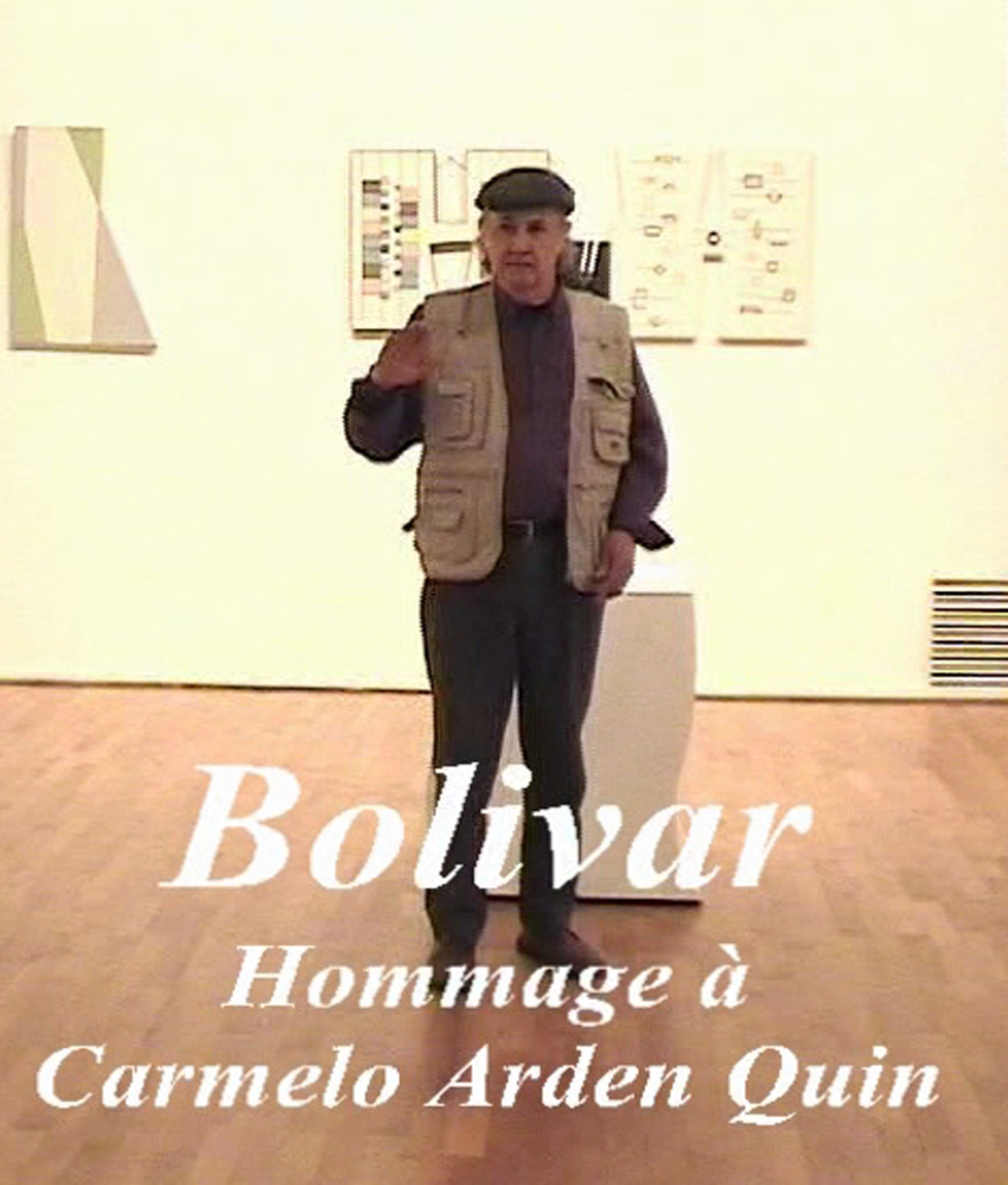 Le soir du vernissage à Cholet, Bolivar est venu me trouver en disant : « Je suis trop ému par cette exposition pour parler, et je voudrais exprimer les choses autrement, je voudrais les mimer ». Alors bien sûr j’ai dirigé ma caméra vers ce qu’il s’est mis à faire, silencieusement, et puis je me suis souvenue du titre d’un texte de Claude Dorval dans le catalogue de l’exposition « Bolivar, vers une nouvelle rationalité » à la galerie Arte Struktura de Milan en mars 1994. Claude Dorval, sa galeriste parisienne avait titré : « Bolivar, le secret de ces non-dits ». Bolivar et le secret, Bolivar et le silence m’ont encore menée plus loin, vers les rives premières de Madi, vers les danses Madi que des danseuses, Renate Schottelius et Paulina Ossona, avaient dansées, chorégraphiées par Arden Quin. Mais j’y reviendrai. Le texte de Claude Dorval a le mérite supplémentaire de faire résonner une fois de plus cette bi-polarité que l’on retrouve presque emblématiquement dans la filiation Torres-Garcia/Arden Quin/Bolivar, et qui tournerait autour de l’idée qu’ils sont trois « êtres de la Frontière ». Elle écrit : « A mi chemin entre deux mondes, à cheval entre deux civilisations, Bolivar est né en Uruguay en 1932 à un moment où les peuples préservaient encore jalousement leur identité. De sang mêlé, indien et européen, Bolivar porte en lui la trace de ses ancêtres en une expression aujourd’hui inscrite dans la modernité. Ses structures sur bois en particulier, miniatures aux couleurs chaudes et denses, comme repliées vers l’intérieur, renferment en elles un certain silence,