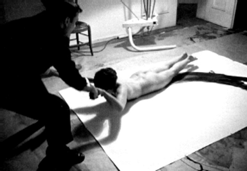 Le 5 juin 1958 Klein réalise une première séance publique chez Robert Godet, où un modèle agit « comme un pinceau vivant » (terme qu’Eléna n’aime pas beaucoup), mais il aura fallu toutes ces séances où les « modèles » se promenaient nues dans l’atelier. Non pas des modèles professionnels mais Rotraut, et des amies communes, Gil Langlois et Eléna Palumbo. Dans « Dimanche », cette précision : « Et puis mon œuvre n’est pas une recherche, elle est mon sillage ». Devant notre caméra, Eléna Palombo Mosca suggère que certaines Anthropométries ressemblent au saut dans le vide de Klein : une calligraphie de corps, une sorte d’aile. Elle-même a fait des sauts de l’ange en tant que plongeuse acrobatique. Et la photo montrant Yves Klein et Elena Palumbo réalisant une Anthropométrie (ANT 111), 14, rue Campagne-Première, en 1960, est exactement ce mouvement de traction, de glissement, recourbé… Est-ce l’Anthropométrie « Princesse Héléna », qui est produite ce jour-là ? Difficile à dire, sur la photo le geste n’est pas achevé.