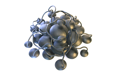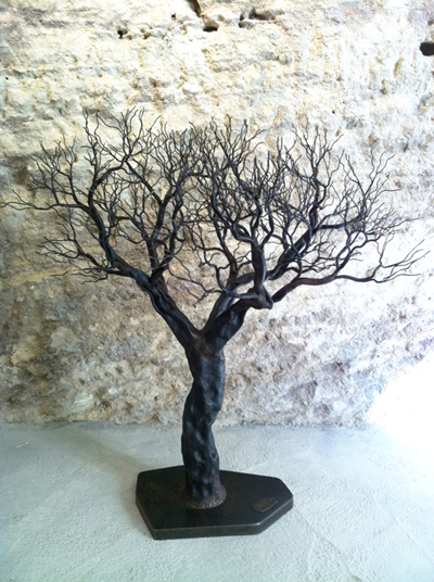 Il travaille aujourd’hui à partir de matières industrielles, tentant de redonner la vie à des matériaux inertes, cassant l’aspect froid du métal pour le montrer autrement, le texturer, et détourner la matière pour retrouver des choses vivantes : arbres, formes molles organiques… Un travail d’harmonie, d’équilibre. Ses arbres en sont la preuve : dentelles de fer, finesse des feuilles, détails des branches, ramifications.