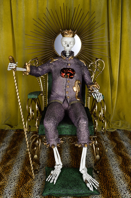 Dans cette île les catacombes, comme celle des Capucins à Palerme, parsèment la terre : elles sont romaines, chrétiennes, juives, en particulier vers Agrigente dans la partie occidentale de l’île. Alberghina expose alors au grand jour ce qui est souterrain. Il n’est pas plus morbide que l’était Jérôme Bosch, mais avec autant d’imagination et d’outrance. Cette sensualité mortifère est accentuée par la beauté du brillant de la céramique. Ses sculptures deviennent alors séduisantes et parfois baroques. C’est le cas de ce roi présenté à Menton, squelette blanc richement vêtu et couronné, assis dans un fauteuil doré et nimbé d’un soleil rayonnant. De fait ses squelettes, ses ossements assemblés sont pleins d’humour, de jubilation parfois. Rien n’est gratuit et tout est attrayant.