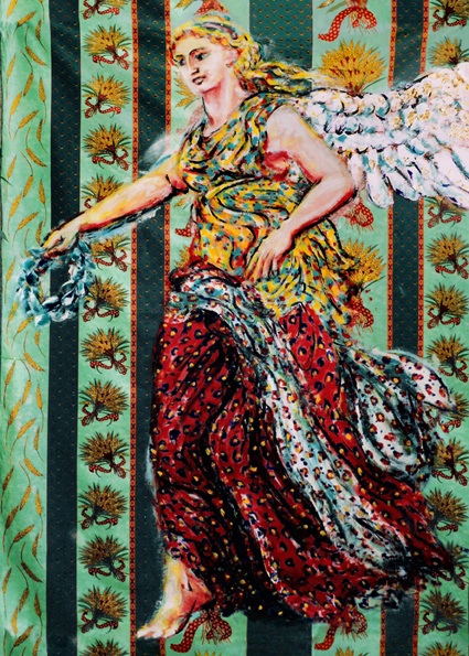 Et pourtant ce stéréotype de la sculpture hellénistique s’impose par la prégnance des couleurs et l’audacieux détournement des supports qui le composent : le typique tissus provençal et la peinture acrylique qui le recouvre. L’osmose entre ces deux parangons de la culture populaire -la Victoire, maintes fois reproduite dans les matériaux les plus divers et souvent les moins nobles en format minuscule, et les tissus provençaux qui trônent dans les supermarchés- provoque l’étincelle propre à inscrire cette oeuvre dans le répertoire de l’art Kitsch ; mais pas seulement...