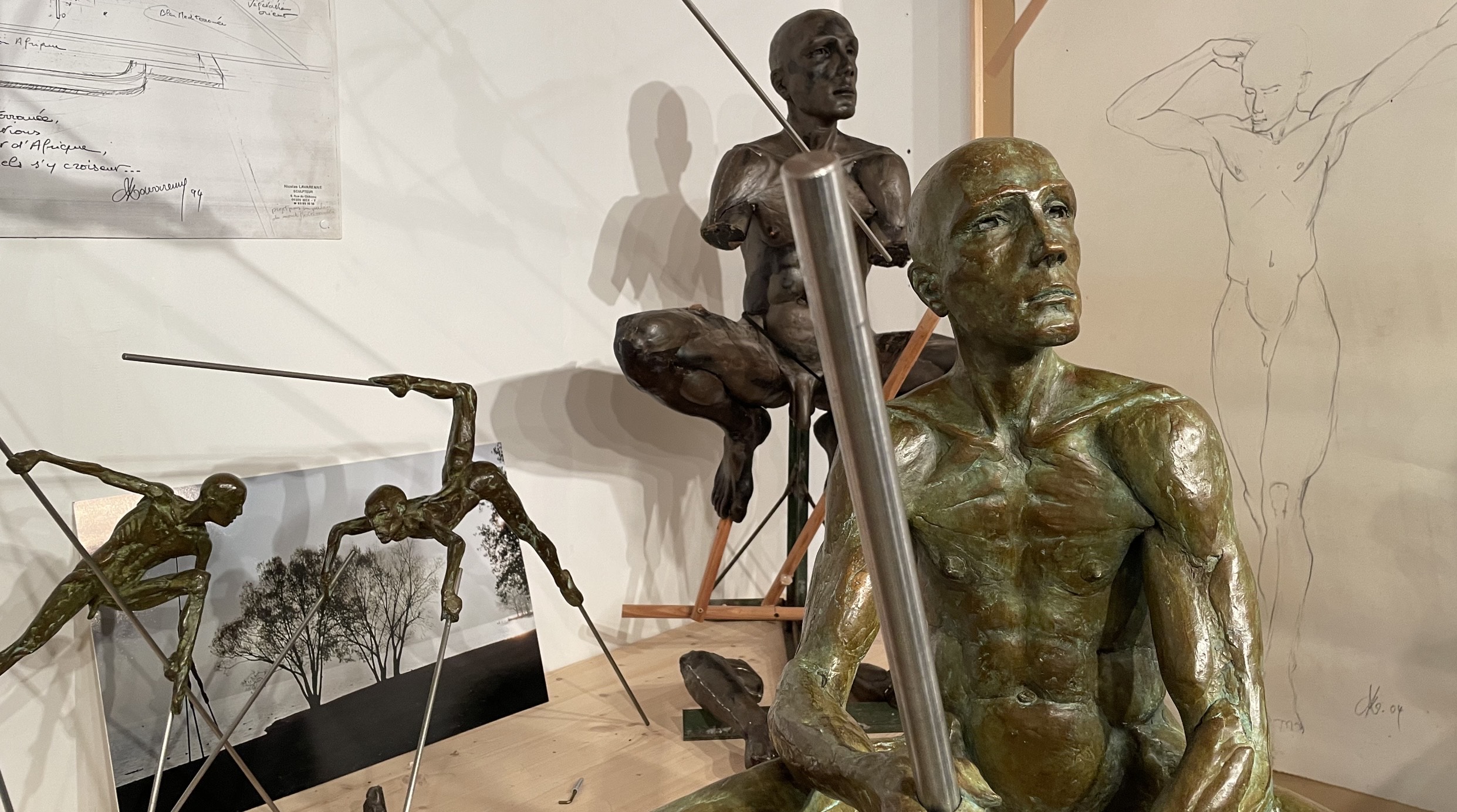 Dans son atelier, sur la mezzanine face à l’entrée, une scénographie composée de très nombreux corps tous différents, la plupart en résine, est impressionnante. Le sculpteur se découvre à travers ses œuvres-miroir, il voit ses évolutions, notamment cette femme allongée « relax sur son fil », preuve d’une sérénité qui s’annonce. Depuis quelque temps, des gargouilles apparaissent, une autre voie possible, ses statues peuvent faire des choses réelles ou irréelles.
