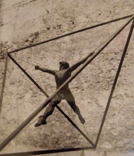 Un souvenir lui revient : « C’était il y a 40 ans, 1982, j’étais sculpteur sur bois et un été j’ai aidé un ami charpentier à construire la charpente d’une grange. Le résultat m’a fasciné. Avec des éléments simples, des segments (poutres) on a constitué un volume fabuleux en plein ciel. Associer charpente et figure m’est venu à l’idée. À l’époque j’étais artisan, sans prétention artistique mais j’ai dû mettre ça dans un coin de ma tête. Plus tard, en 1983, j’ai fait une première sculpture en bois qui m’a inoculé le virus de l’art ; ont suivi quelques pièces cathartiques. Plus tard, en 1988 ma main a dessiné « l’Enragé », un homme tiraillé par chaque angle d’un tétraèdre. J’y ai vu ma condition d’alors, écartelé entre mon gagne pain (que j’aimais), ma famille, l’art que je découvrais et le temps, le temps !… Obsédant ! L’association charpente, géométrie spatiale et figure était là, mais elle exprimait la violence des contraintes. En 1992, juché sur ce tétraèdre est apparu le « Guetteur » et sa symbolique d’à venir, sa géométrie, son architecture, sa singularité de mise en scène et son élévation. Sacha passant par là l’a immédiatement vu. D’autres gestes sont venus, architecturés en tripodes, sortes de propulseurs, lignes de force, lignes à haute tension, l’humain tendu vers une quête, en élévation, détaché de la terre, plus proche du ciel… Enciélé ! ».