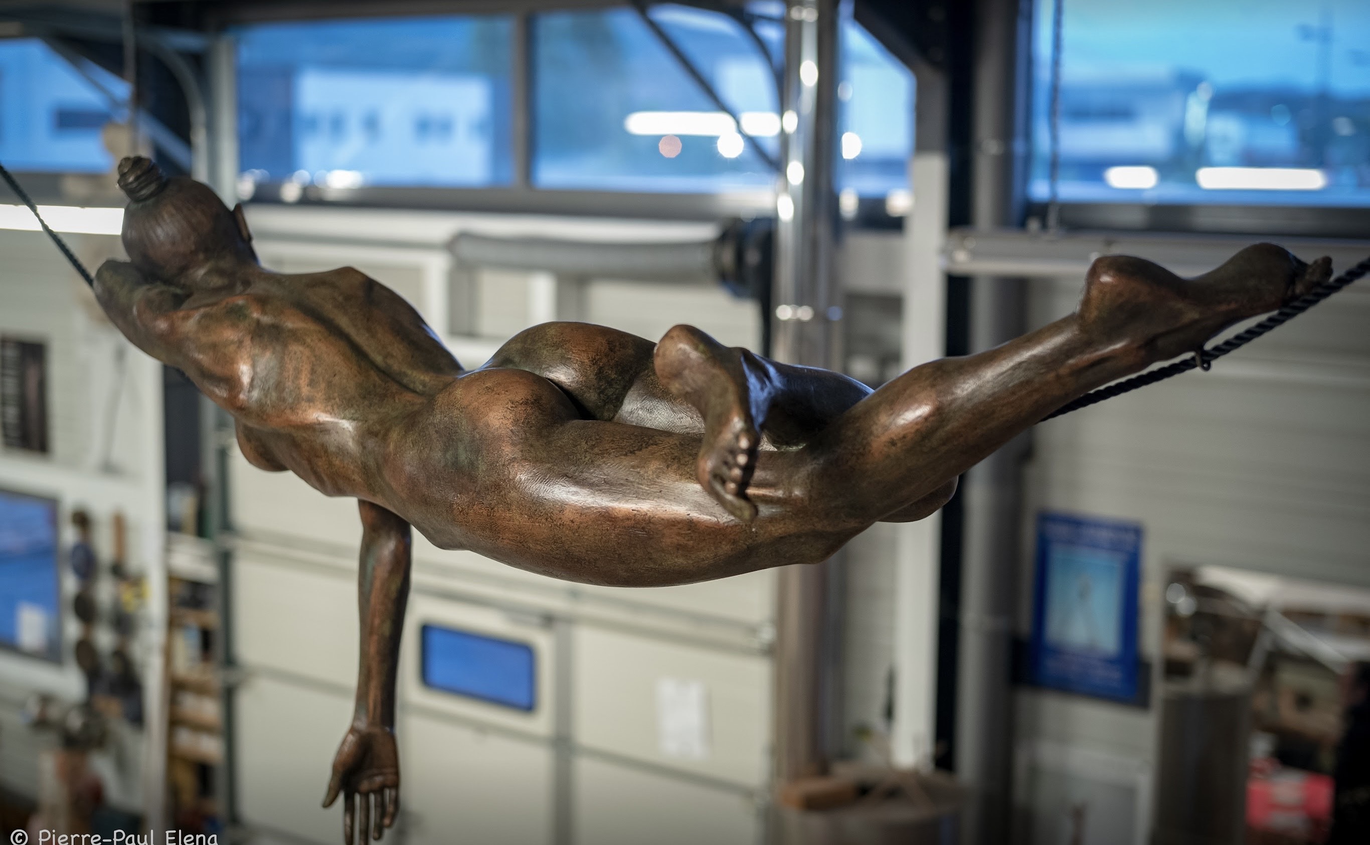 Ses corps toujours nus aux musculatures apparentes participent de la statuaire classique, mais ils ne lui suffisent pas, il a besoin d’extension, de sauts de l’ange à l’image de sa jeunesse à la Réserve où avec ses amis, il faisait des concours de plongeons.