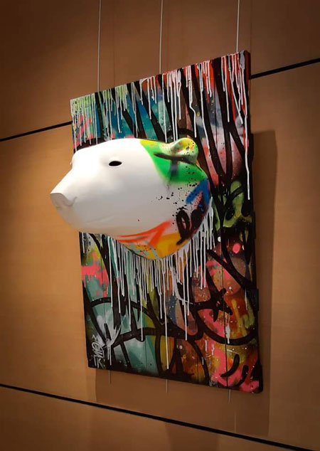 C’est un autre animal menacé que Niki met à l’honneur lors d’une récente collaboration avec Laurent Moulin (Atelier STAMPI) : « J’ai voulu rendre hommage à François Pompon pour la célébration du centenaire de son ours blanc, en reproduisant en résine et façon Pop la tête de son emblématique Ours. »