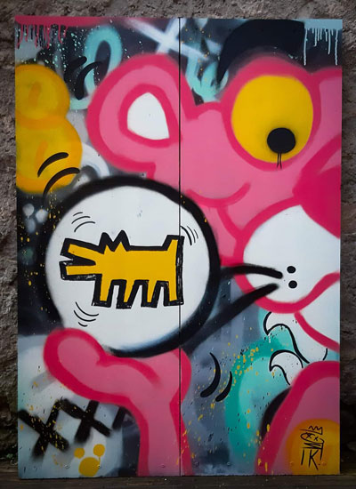 Avant elle bien des artistes et notamment ceux issus du Street Art dont elle s’inspire également ont embrassé ainsi une carrière à l’image de Basquiat et plus tard de Jonone ou Sharp. « La panthère rose créée en 1963, est pour moi un chef d’œuvre graphique qui fait écho aux figures soulignées de noir de Keith Haring » Avec sa peinture « Grunge Panther » Niki s’inspire de ces deux univers : « La panthère rose exprime la vie anticonformiste de Keith Haring : défenseur des droits des homosexuels, le rose étant la couleur qu’ils portaient dans les camps nazis. La figure du chien ou loup de Haring, symbolise le fait que l’homme est un loup pour l’homme. La panthère rose fait référence, bien que le sujet soit dur également, au mouvement black panthers américain qui milita contre l’apartheid dans les années 1960. » A travers cette pièce Niki manifeste sa volonté d’illustrer la lutte du droit à la différence avec douceur. Une douceur récurrente dans sa pratique : « ma touche féminine, se traduit par une recherche sensorielle et instinctive. Le diktat de la pensée de l’artiste contemporain revient à prendre le spectateur par la main. Moi je préfère le prendre par le cœur et l’esprit »