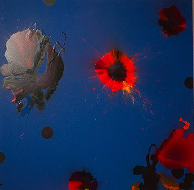 Michel Ange, à l’inverse s’allongeait sur le dos pour peintre son plafond de la chapelle Sixtine. Matisse dans son fauteuil roulant, à la fin de sa vie, réinventait la peinture en peignant du bout d’une perche. Dolla a sa propre méthode : qu’importe la manière pourvu que surgissent les étincelles !