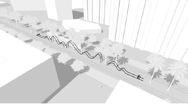 Éloge du déplacement est un « geste graphique, léger et ondulant » qui serpente sur le boulevard Paul Montel. Les lignes de l’oeuvre rappellent les rails du tram au sens propre comme au figurée, car elles constituent pour Philippe Ramette une « voie mentale » et suggère, non sans poésie, l’existence de voies complémentaires et alternatives.