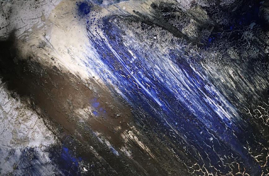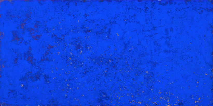 Une majestueuse peinture de la série ‘‘Bleu Monochrome’’, créée à partir de pigments naturels d’un bleu particulièrement intense, invoque les étendues infinies des mers et des océans. La matière est ici nourrie de multiples végétaux, fragiles et délicats, qui animent la surface de la toile.