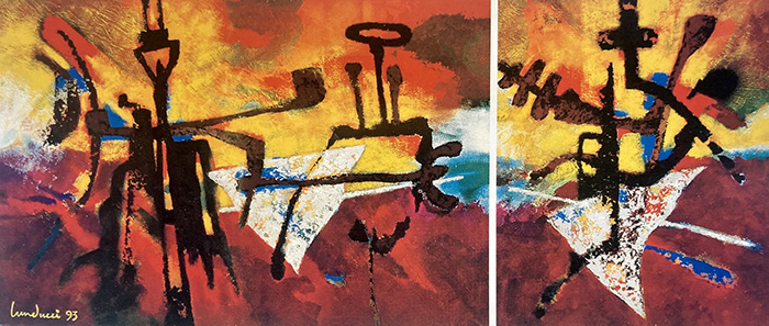 Les formes, les styles de ses dernières séries « Les chimères - 2001 », les « Rêveries et Rivages - 2003 », les « Passages - 2005 », les « Ecrimages - 2008 » les « répétitions - 2010 », sont autant de jalons sur sa longue route qui est plutôt un large chemin de campagne, un sentier de montagne, un routin hors de routines, des chemins de traverse hors des sentiers battus. Landucci est un peintre de grands chemins.