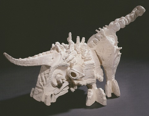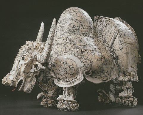 Marc Piano a donc installé une forme d’éternité chez lui avec cet étrange poisson, et ce n’est pas pour rien car tout son travail n’est qu’un hommage au Temps, aux différents temps qu’il subvertit en s’appropriant leurs formes reconnues pour les écrire autrement, et les renvoyer ainsi à l’insondable. Un autre cœlacanthe, anthropomorphe cette fois car on peut y lire des visages miniatures et même une forme féminine englobante, vient dire que le cœlacanthe c’est nous, intemporels dans l’océanique qui est notre dimension intime et dans lequel – par lequel – nous sommes reliés à l’univers. Marc Piano fait un sort à l’idée d’antenne – qu’il faut décrasser (par un ramonage de cheminée, dirait Anna O), et dans la médecine chinoise et autres interprétations entre bouddhisme et zen, l’être humain est une antenne entre ciel et terre. « Corne », pièce de 2005, est un animal-corne, tout y est érectile comme pour pouvoir toucher un maximum de la surface du monde, et le « Mastar » de 2006, en dehors de son premier degré d’humoristique appellation, est un bijou à dimension surhumaine, une montagne gravée de civilisation, Everest sculpté par le langage, même sous forme d’alphabets inconnus comme peuvent l’être les codes des forêts, pas encore articulés. On est un peu dans une holophrase plastique, à coups d’idéogrammes avant la lettre si je peux dire, un peu comme les Indiens d’Amazonie inscrivaient sur leur corps leurs structures élémentaires de la parenté.