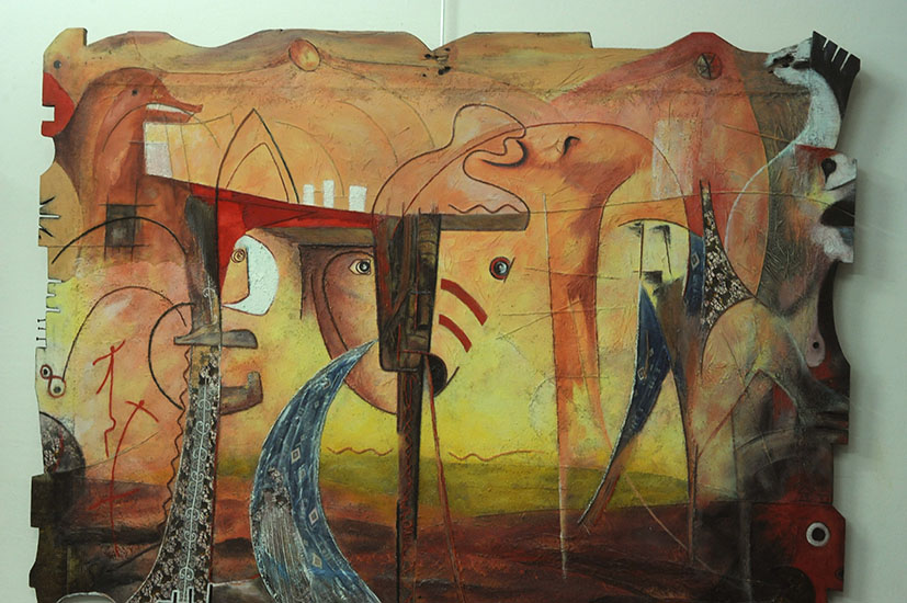 Une œuvre s’explique par l’homme qui se cache derrière elle. Si on ne connaît pas l’artiste, ou si celui-ci ne donne pas les clés, une grande partie du sens des tableaux échappe. Derrière chaque être se trament les ramifications d’une généalogie sur le fond d’histoire. Rico Roberto, Robert Juste de son vrai nom, est arrivé de Paris un jour avant les émeutes de mai 1967 en Guadeloupe, qui ont donné lieu à un massacre aujourd’hui oublié, du moins en métropole. Lui témoin, lui musicien, lui poète subversif et plasticien commémore cette année les 50 ans de cette page tragique de la vraie histoire de son peuple. Dans la galerie, il a scandé ses vers, en interpellant le public dans la plus pure tradition caribéenne, utilisant les percussions et la flûte.
