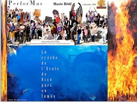 Les discours sur l’Ecole de Nice ne sont pas clos ! Bien au contraire, avec le temps ils redoublent. Ainsi, depuis que nous avons lancé cette Chronique sur Art Côte d’Azur, a-t-on pu observer une vente aux enchères, la sortie d’un film -dont la plupart des séquences ont été tournées il y a plus de 10 ans- et d’un nouveau livre et une exposition au Musée Rétif à Vence. Celle-ci s’est terminée par un événement, une Performas : « la mise à feu de la crèche de Jean Mas », par l’artiste lui-même, devant « clore » ou « dissoudre » ce mouvement artistique.