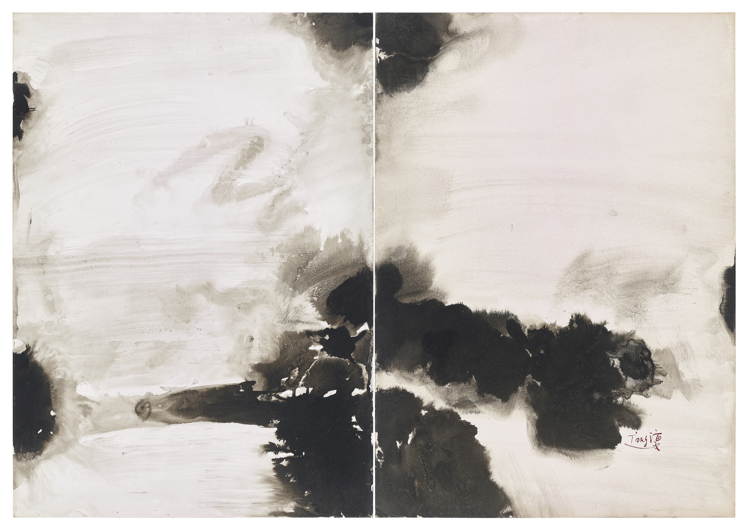 Sensibilisé très jeune à l’art de la calligraphie par son grand-père, l’artiste sera par la suite profondément influencé par la pensée taoïste et sa tradition picturale. Il dit : « Je recherche un art sans contrainte dans lequel j’évolue librement. ». Un geste minimaliste suffit à évoquer la profondeur de son répertoire. À partir des années 60, T’ang Haywen produit des œuvres exclusivement à l’encre, à quelques exceptions près. Le choix du médium s’explique par la vie du peintre, humble et spirituelle, et faite de nombreux voyages pour lesquels il lui était plus facile d’emporter feuilles et encre plutôt que toiles et châssis. Cet artiste, souhaitant s’affranchir de toute contrainte et privilégiant le dépouillement, trouve une plus grande liberté d’expression dans l’encre qui lui permet de jouer avec les pleins et les vides. Le diptyque devient son format de prédilection. Celui-ci, tout comme l’utilisation quasi systématique de formats standards (toutes les œuvres de la vente sont des diptyques de 70 x 100 cm) lui permet également de ne plus se soucier des dimensions du support qu’il va utiliser mais de se concentrer sur l’essentiel : la peinture et l’acte de peindre.