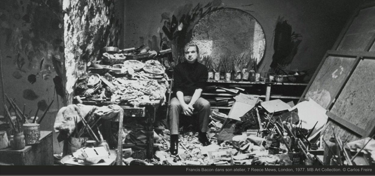 Plusieurs photos de Bacon dans son atelier montrent le chaos dont il a besoin de s’entourer pour peindre.