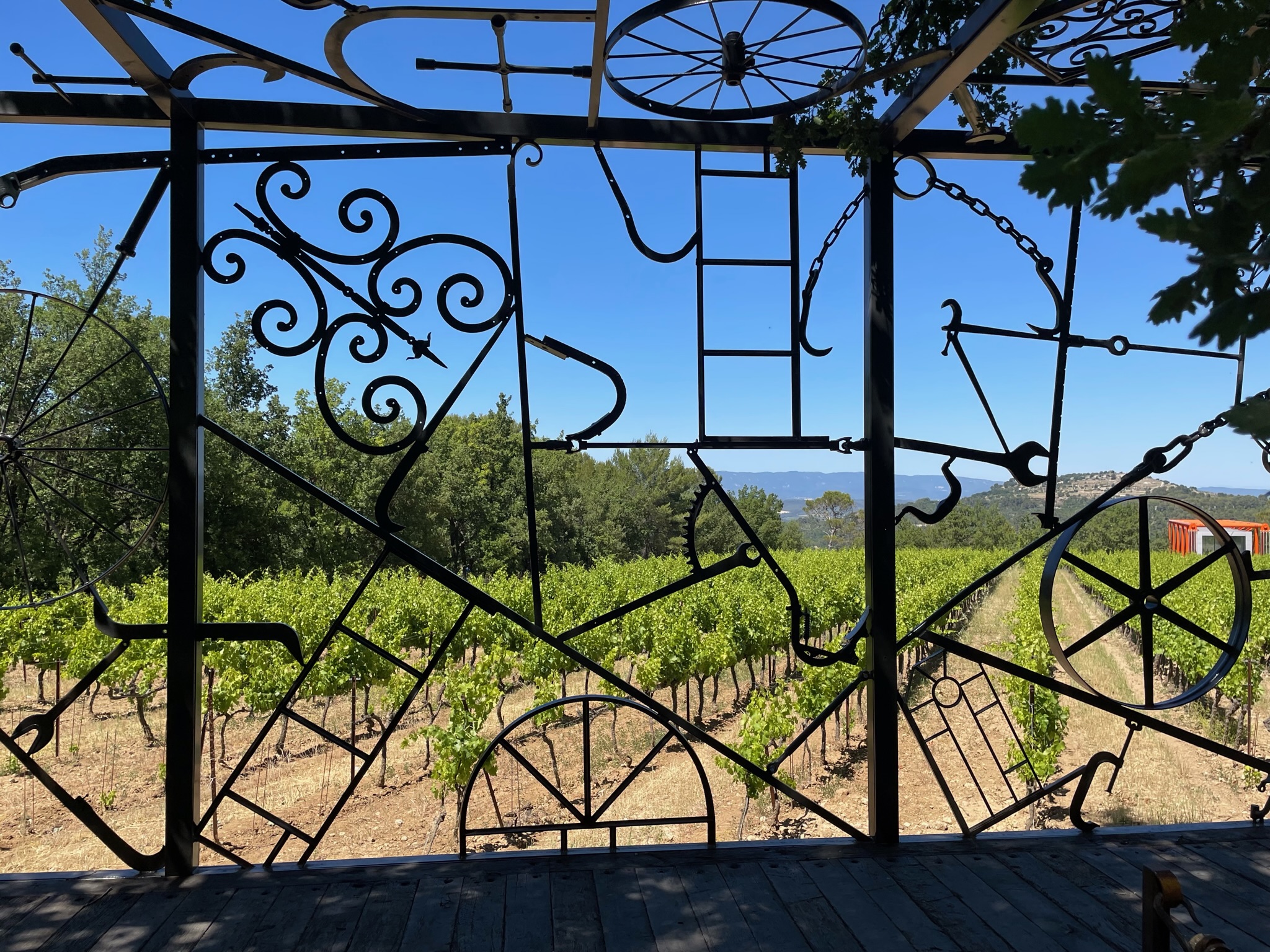 A partir de là, un parcours jalonné d’œuvres d’art est proposé à travers les rangées de vignes cernées de chênes, d’oliviers et de pins qui heureusement apportent un peu d’ombre (la balade est longue, il y a tellement à voir).
