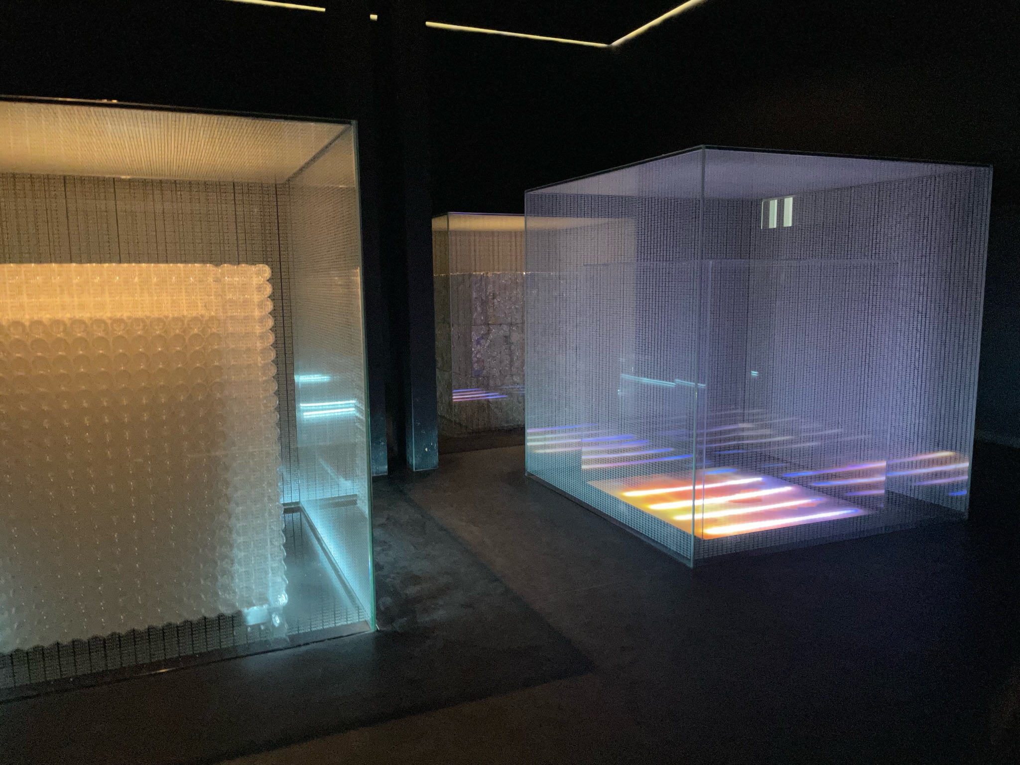 Deux œuvres de Sean Scully, une évoquant le vide (Box full of air) et l’autre, le plein : un cube monumental de pierres calcaires de plusieurs couleurs, entre le rouge, le gris et l’ocre. (Wall of lights).