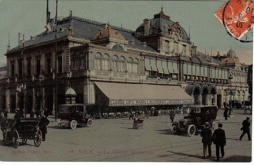 Et pour terminer cette série, cette très belle carte du Casino Municipal qui se trouvait Place Masséna. Ce fut un complexe de divertissements avec théâtre, cercle et salles de jeux, grand hall et salles de réception, réalisé entre 1882 et 1884 à l’initiative du promoteur Omer Lazard qui l’exploita et en contrepartie couvrit le Paillon pour terminer la Place. Il fut transformé entre 1939 et 1940, puis démoli définitivement en 1979. Sur la gauche, le célèbre restaurant qui n’osa jamais mettre sur sa carte les Merda de can… Trop populaire pour le standing de l’établissement !