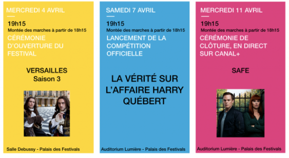 * La cérémonie de Lancement de la Compétition Officielle le samedi 7 avril avec la projection Hors Compétition de la série La Vérité sur l’affaire Harry Quebert réalisée par Jean-Jacques Annaud d’après le roman de Joël Dicker – dans la limite des places disponibles –,