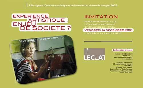 La rencontre annuelle 2012 aura lieu à Nice, Villa Arson, le vendredi 14 décembre 2012, de 9h à 17h, sur le thème "Expérience artistique, enjeu de société ?". La journée développera plusieurs pistes : la jeunesse et son environnement numérique, les situations de programmation "hors piste", la société du "tout images", en se nourrissant d’expériences et d’interventions ciblées (programme détaillé ci-dessous).
