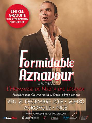 Afin que le plus grand nombre puisse rendre hommage à cette légende de la chanson française, Christian Estrosi, Maire de Nice, Président de la Métropole Nice Côte d’Azur, Président délégué de la région Provence Alpes-Côte d’Azur invite les niçois pour une représentation gratuite exceptionnelle de « Formidable Aznavour », le vendredi 21 décembre prochain, à Acropolis.
