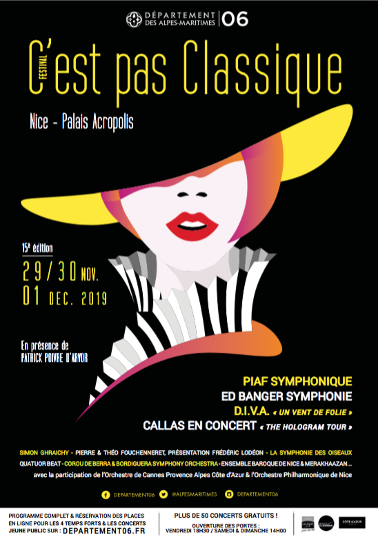 Organisé par le Conseil départemental des Alpes-Maritimes depuis 2005, « C’est pas classique » est devenu un incontournable de l’agenda musical classique. Cette année encore, ce sont plus de 50 concerts gratuits et animations qui pendant 3 jours mettront à la portée de tous la musique classique autrement. Amateurs, spécialistes, en recherche de nouveautés, ce Festival apportera à tous des sensations et une émotion unique.