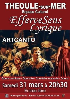 Le 31 mars 2012, concert EfferveSens Lyrique gratuit ! Un événement organisé par le service culturel de la ville de Théoule-sur-mer et présenté par l’ensemble ARTCANTO (25 artistes) à l’espace culturel.