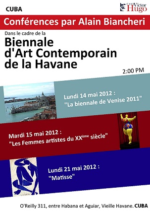 Alain Biancheri propose trois conférences, dans le cadre de la Biennale d’Art Contemporain de la Havane à Cuba. Rendez-vous les 14, 15 et 21 mai 2012 à la Casa Victor Hugo, La Havane.