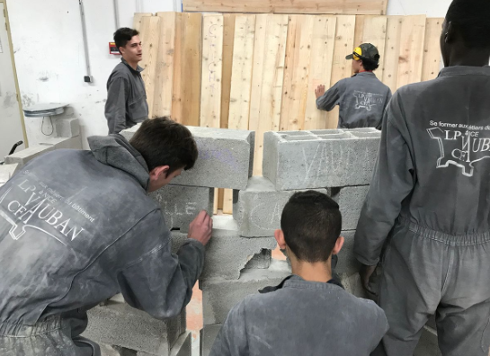 Accompagnés par le comédien Frédéric de Goldfiem et Éric Oberdorff, les élèves maçons du Lycée Vauban se sont à leur tour emparés de ces thèmes au cours d’une série d’ateliers corps et voix pour bâtir LE MUR.