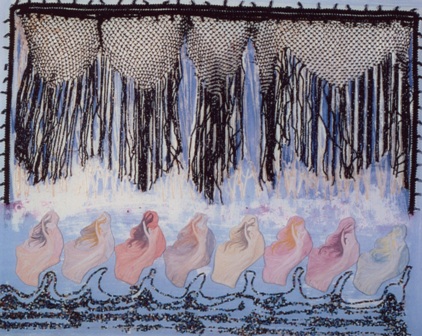 Mais de la technicité elle va pourtant prendre ce qui mène à la « structure », comme le montre le « Graphe n°7 » de son époque Beaux Arts à Nice, ce que confirme le « moucharabieh » bleu de 1991 derrière lequel elle se cache sur la couverture du livre « Nivèse, la part féminine de l’Ecole de Nice » (France Delville, éd. Melis), car cette grille aussi s’appelle « Graphe ». Mais Nivès, en ébullition créatrice, quitte l’école, cherche son fil, qu’elle trouve dans les dentelles des Puces, pour une nouvelle archéologie.