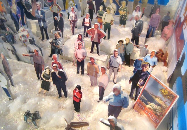 A la place de Jésus, un livre blanc, à la place du bœuf et de l’âne, une autruche (dont les plumes, chacun sait, ont contribué à la confection de multiples chasse-mouches ! ). Freud est présent dans la foule, ainsi bien sûr qu’Alexandre de la Salle, et Ben avec son panneau, et la Ligne indéterminée de Bernar Venet, et l’Homme de Pierre de Max Cartier, et des bouteilles de vin de Bellet etc. etc.