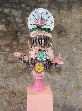 Entre heroic fantastique et statuaire africaine, primitive ou ethnique, les masques et bustes en faïence émaillées de Catherine Ferrari sont colorés, surbrillants.