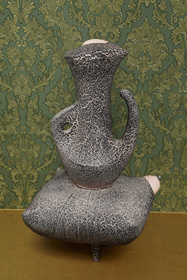 Dans une installation originale de papier peint et de médaillons ovoïdes sont présentées des sculptures où la terre s’est faite chair, muqueuse humide et brillante : vagins-fleurs, orifices-origines du monde, abîmes mystérieux et attirants, lèvres-vulves, cols, cous, aux couleurs « sucrées » des dessous féminins. Des grotesques et des grottes rappelant l’univers de Jérôme Bosch, mais sans son foisonnement, dans une pureté, une simplicité directe et joyeuse.